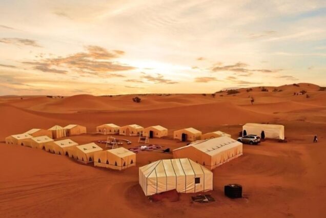 Spend the day immersed in desert life. Visit Khamlia, a village known for Gnawa music, and discover nearby oases where locals live in harmony with the desert. Enjoy a camel trek across the dunes and admire a mesmerizing sunset. Overnight in a desert camp under the starry Saharan sky.
